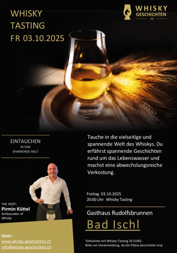 Wie im Vorjahr laden wir euch auch heuer gemeinsam mit Pirmin Küttel zu einer spannenden und abwechslungsreichen Whisky-Verkostung ein.